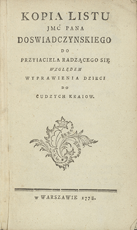 Czartoryski Adam Kazimierz (1734-1823). Kopia listu JMĆ Pana Doświadczyńskiego do przyjaciela radzącego się względem wyprawienia dzieci do cudzych krajów (pol.)