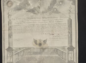 Dokument wystawiony w formie ozdobnego w emblematy i symbole masońskie dyplomu z drukowanym formularzem.
