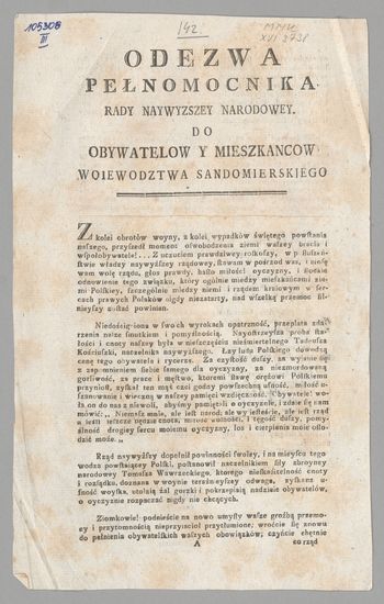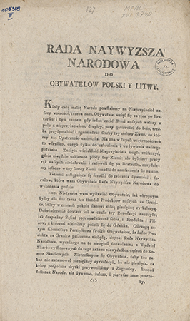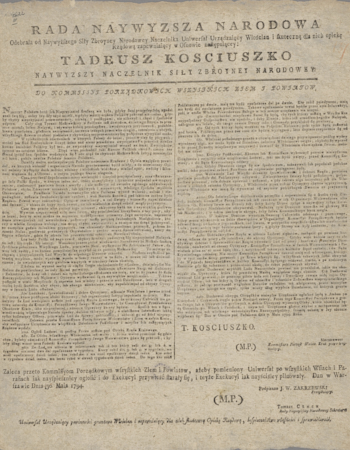 Tyt. nagł.: Rada Naywyzsza Narodowa Odebrała od Naywyższego Siły Zbroyney Narodowey Naczelnika Uniwersał Urządzaiący Włościan i skuteczną dla nich opiekę Rządową zapewniaiący w Osnowie następuiącey : Tadeusz Kosciuszko ... do Kommissyi Porządkowych Wszystkich Ziem i Powiatow