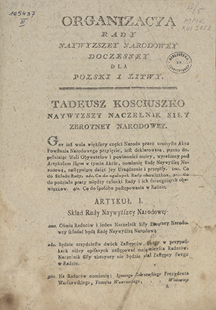 Tyt. nagł.: Tadeusz Kosciuszko Naywyzszy Naczelnik Siły Zbroyney Narodowey : Organizacya Rady Naywyzszey Narodowey Doczesney