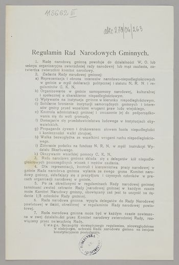 Regulamin Rad Narodowych Gminnych. - [Warszawa] : [wydawca nieznany], [1916]. - [1] karta ; 23x15 cm.