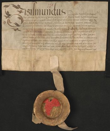 Pieczęć króla Zygmunta Starego zawieszona na pergaminowym pasku [prawie całkiem wykruszona, widoczny fragment herbu].
