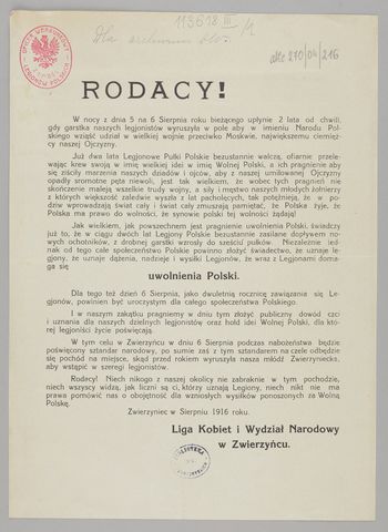 Rodacy! / Liga Kobiet i Wydział Narodowy w Zwierzyńcu. - [Miejse nieznane : wydawca nieznany], VIII 1916. - [1] karta (1 strona.) ; 28x20 cm.