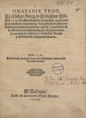 Na stronie tytułowej dopisano uwagę: "Inter rarissima monumenta ariano(..) liber".