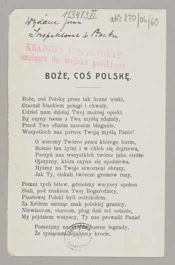 Boże, coś Polskę : Pieśń. - [Płock : Krajowy Inspektorat Zaciągu do Wojska Polskiego, 1916-1917]. - [1] karta (2 strony) ; 17x11 cm.