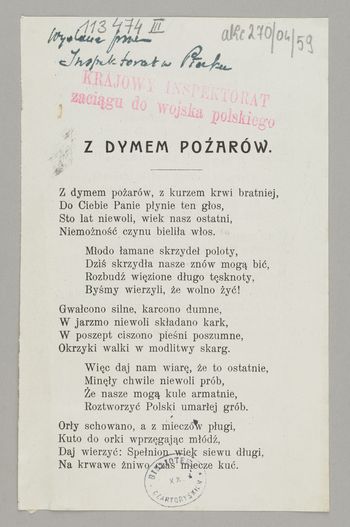 Z dymem pożarów : Pieśń. - [Płock] : [Krajowy Inspektorat Zaciągu do Wojska Polskiego], [1916-1917]. - [1] karta (2 strony) ; 17x11 cm.