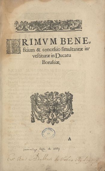 Primvm beneficium & concessio simultaneae investiturae in Ducatu Borussiae. - [Królewiec : Osterberger Jerzy, około 1590]. - [50] kart, sygnowanie A², B⁴, C⁶, D⁴, E², F-H⁴, I⁶, K-L², M⁸,N² ; 2°.