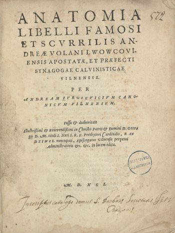 Na stronie tytułowej "Anno Domini M.D.XCII. XII. Kalend. Septembr." do "M.D.XCII." dodano ręcznie "I" co sugeruje mylnie rok 1593. Na s.tyt.verso herb kanonika z inicjałami: I[oannes] B[ulpatus] C[anonicus] V[ilnensis].