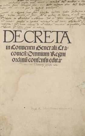 Decreta in conventu generali Cracoviensi : Omnium Regni ordinu consensu edita. - Dat.Cracoviae in Conventu generali : Wietor Hieronim, 1527 III.19 po]. - [6] kart, sygnowanie A⁶ ; 2°.