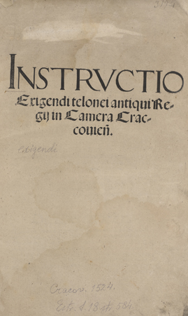 Instrvctio exigendi telonei antiqui Regij in camera Cracovien[si]. - [Kraków : Wietor Hieronim, po 1538]. - [6] kart, sygnowanie a⁶ ; 2°.