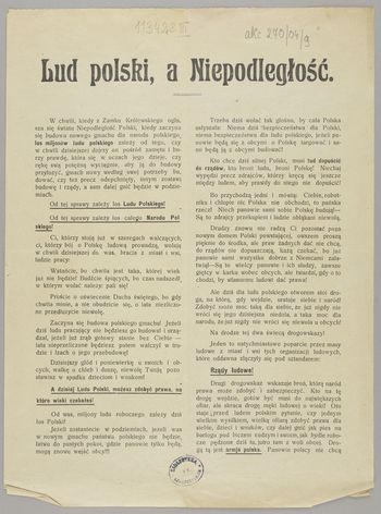 Lud polski, a Niepodległość. - [Warszawa : Wydawnictwo Wojska Polskiego] : "Rząd i Wojsko", [1917]. - [1] karta (2 strony) ; 31x23 cm.