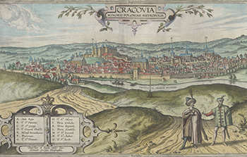 Cracovia Minoris Poloniae Metropolis / Depictum ab Egidio vander Rye, communic[avit] Georgius Houfnaglius. - [Coloniae Agrippinae] : [sumptibus authorum], [1618]. - 1 panorama : miedzioryt kolorowany ręcznie ; 30,0x53,0 cm, na arkuszu 34,0x56,5 cm.