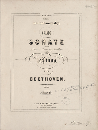 Grande Sonate : suivie d'une Marche funébre pour le piano : Op. 26 / par Beethoven. - Paris : Brandus et Cie., [po 1846]. - [2], 16 stron (paginacja ciągła strony 180-195) ; 34 cm.