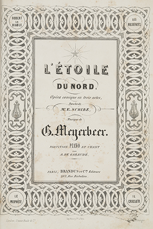 Tektura, niebieski aksamit, superekslibris w środku okładziny przedniej : tłoczone złotymi literami inicjały C V, na grzbiecie napis-Meyerbeer L'Etoile du Nord ; brzegi kart złocone.