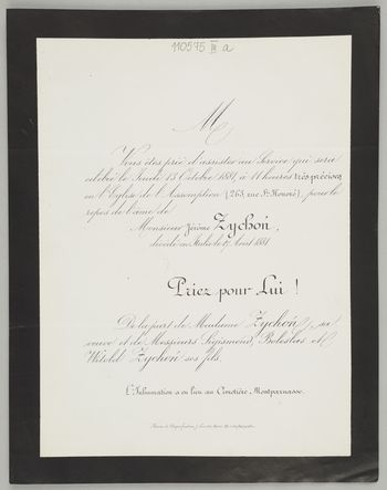 Zawiadomienie o pogrzebie na cmentarzu Montparnasse.