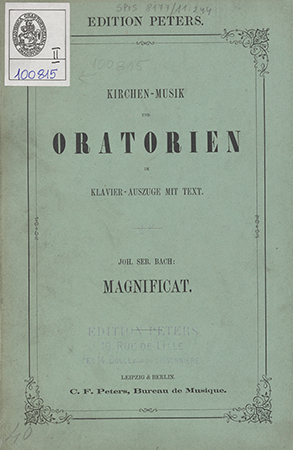 Oratorien, Messen u. andere Kirchenmusik im Klavierauszuge mit Text. Nr 5, Magnificat / Bach J. S. ; Klav. Auszug von Hugo Urlich. - Leipzig et Berlin : C. F. Peters, Bureau de Musique, [1870] (Leipzig : Schnellpresse-Druck der Röder'schen Officin). - [2], 56 stron ; 25 cm
