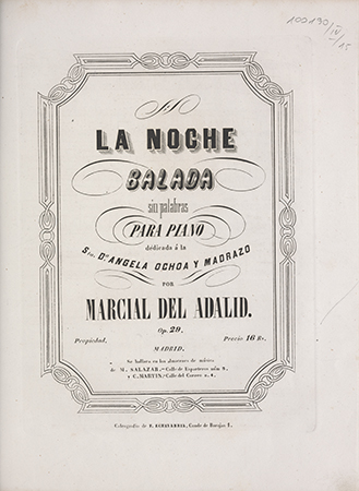 La Noche : balada sin palabras para piano : Op. 29 / por Marcial del Adalid. - Madrid : Salazar M. y Martin C., [około 1860] (Madrid : F. Echevarria (calcografia). - [2], 7 stron : ilustracja ; 33 cm.