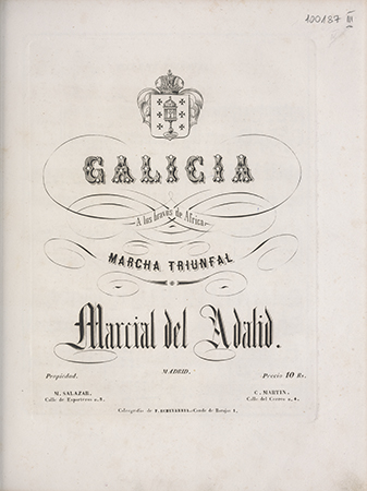 Galicia : Marcha triunfal / Marcial del Adalid. - Madrid : M. Salazar ; C. Martin, [około 1860] (Madrid : F. Echevarria (calcografia). - [2], 3 strony : ilustracja ; 32 cm.