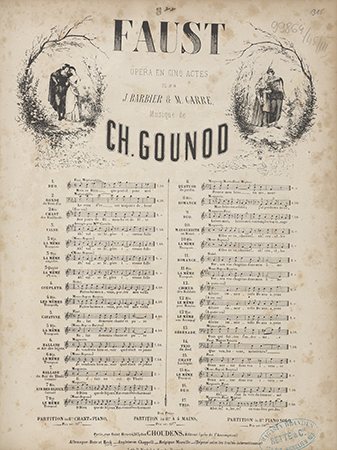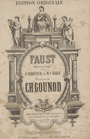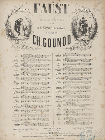 Faust : opéra en 5 actes / de J. Barbier et M. Carré ; musique de Ch. Gounod ; réduit au piano par Émile Périer. - 3.e Édition avec les récitatifs ajoutés par l'auteur - Paris : Choudens Père et Fils, Edit.rs, [po 1875]. - [2], 132 strony : ilustracje (frontispis) ; 27 cm.