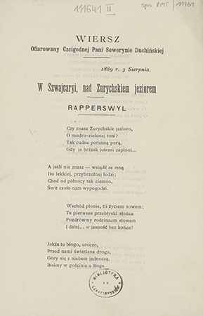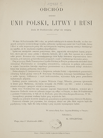 Zawiera: Odezwa [incipit:] Powzięta w szerokim kole obywatelskim, poparta gorąco [...], We Lwowie, dnia 21 grudnia 1892 roku / prezes wystawy: Adam Sapieha; wiceprezesowie: Stanisław badeni, August Gorayski, Edmund Mochnacki, Feliks Szlachtowski; dyrektor wystawy: Marchwicki. - [Incipit:] W dniu 25 marca r.b. postanowieniem Dyrekcyi Wystawy, miałem zaszczyt być powołany i naznaczony Delegatem Generalnym na Francyę [...] / Paryż, dnia 21 kwietnia 1893 r. J. N. Rayski Fabrykant haftów kanwowych artystycznych ręcznych. Medal srebrny na Wystawie Międzynarodowej w Paryżu z 1878 r.