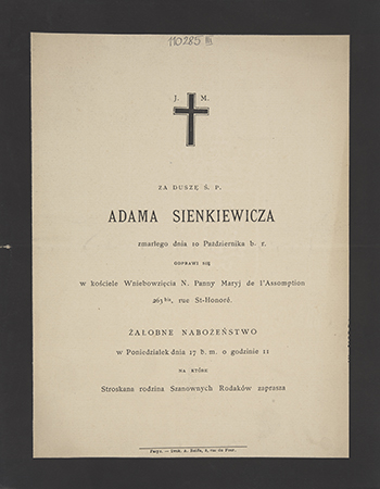Zawiadomienie o nabożeństwie żałobnym w kościele Assomption w Paryżu.