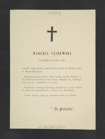 [Nekrolog. Incipit] Marceli Tąszewski żołnierz z roku 1863 [...]. - Paryż : Druk. A. Reiffa, 1895. - [4] strony (1 karta złożona) ; 27x21 cm.