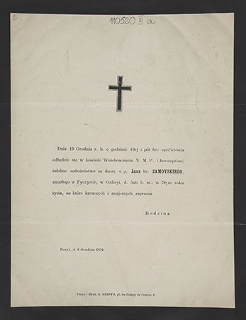 Zawiadomienie o pogrzebie na cmentarzu Père Lachaise (Paryż).