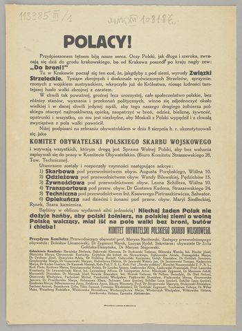 Odezwa informująca o ukonstytuowaniu się w Krakowie Komitetu Obywatelskiego Polskiego Skarbu Wojskowego i wzywająca do współpracy z nim. Pod tekstem znajdują się nazwiska wszystkich członków Komitetu.