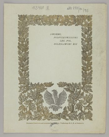 Na licu ramka z liści dębowych druk. złoto oraz orzeł legionowy.