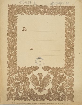Druk brązowy, na licu ramka z liści dębowych i orzeł legionowy.