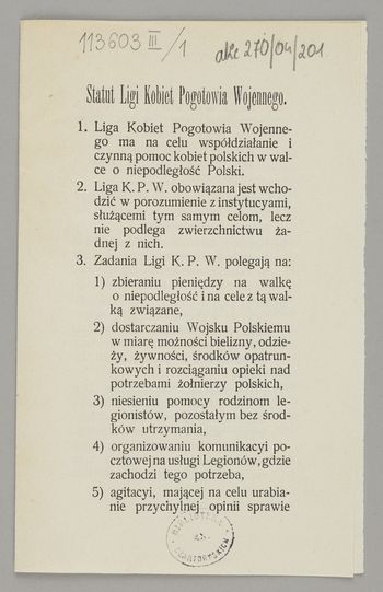 Statut Ligi Kobiet Pogotowia Wojennego. - Piotrków : Druk. Państwowa pod zarządem Departamentu Wojskowego NKN, 1914. - [1] karta złożona (4 strony) ; 18x11 cm.