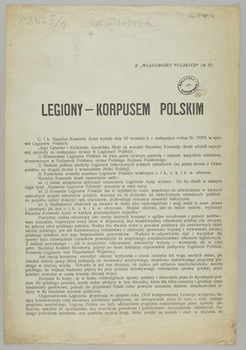 Legiony Polskie. - Piotrków : Druk. Państwowa pod zarządem Departamentu Wojskowego NKN, [1914]. - [1] karta złożona (4 strony) ; 23x16 cm.