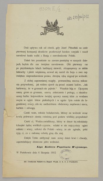 Odezwa patriotyczna w związku z rocznicą przekroczenia przez Kompanię Kadrową granicy zaboru rosyjskiego, oddająca hołd Józefowi Piłsudskiemu i żołnierzom Legionów.