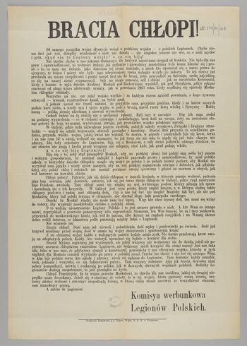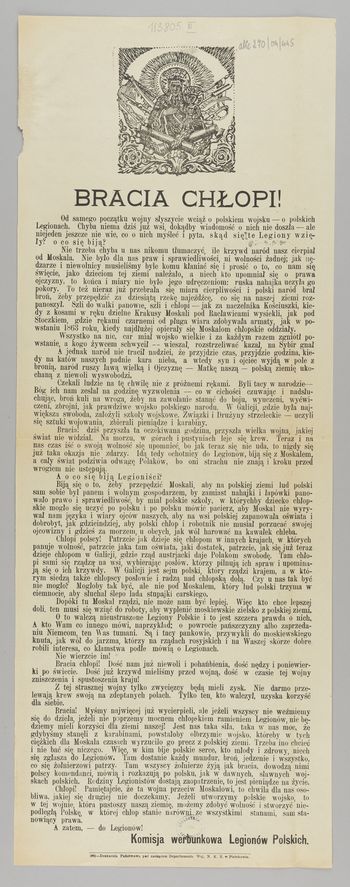 Bracia chłopi! / Komisya werbunkowa Legionów Polskich. - War. B. - Piotrków : Druk. Państwowa pod zarządem Departamentu Wojskowego NKN, [1915]. - [1] karta (1 strona) : ilustracje ; 50x35 cm.