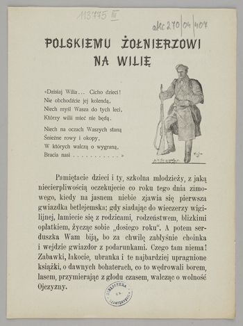 Na węgierskiej ziemi / Józef Andrzej Teslar Legionista. - Piotrków : Druk. Państwowa pod zarządem Departamentu Wojskowego NKN, 15 I 1915. - [1] karta złożona (3 strony) : ilustracje ; 25x20 cm.