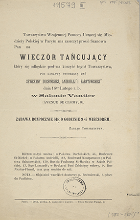 Tyt. nagł.: Przedstawienie amatorskie Towarzystwa Filharmonicznego Polskiego w Paryżu pod dyrekcją pana Zygmunta Seyfrieda zw współudziałem pana Obryckiego.