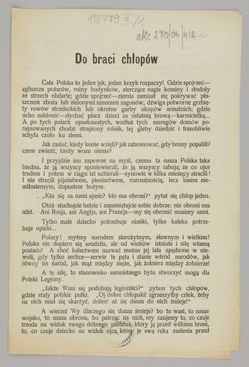 Do braci chłopów / Stefan Syrek. - Piotrków : Drukarnia Państwowa pod zarządem Departamentu Wojskowego NKN, [1915]. - [1] karta złożona (4 strony) ; 24x16 cm.