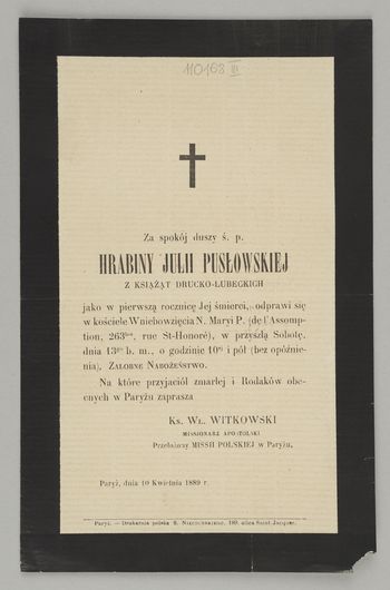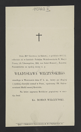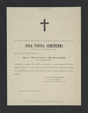 Zawiadomienie o nabożeństwie (mięsięcznica śmierci) w kościele polskim de l'Assomption.