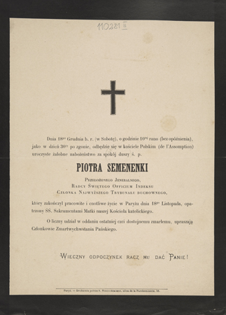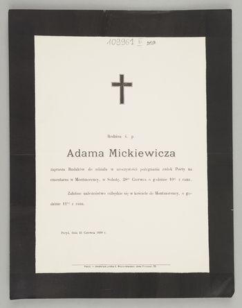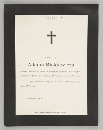 Zawiadomienie o pogrzebie na cmentarzu Montmartre (Paryż).