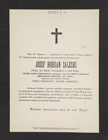 Zawiadomienie o nabożeństwie w rocznicę śmierci i uroczystościach związanych z przeniesieniem zwłok poety na Wawel.