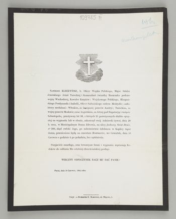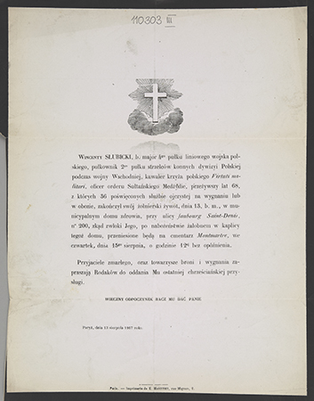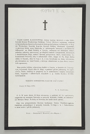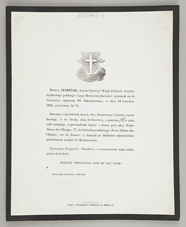 Zawiadomienie o nabożeństwie i pogrzebie na cmentarzu Montmartre w Paryżu.