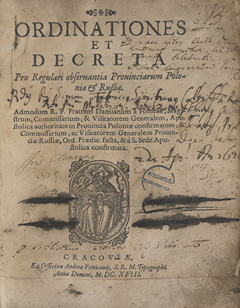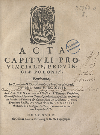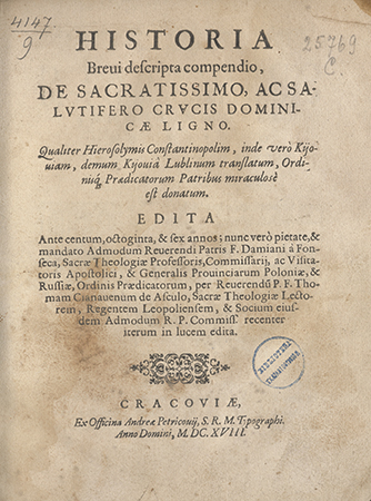 Drzeworyty: na stronie tytułowej w medalionie św. Trójca, na verso karty tytułowej wizerunek św. Jacka.