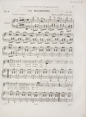 La macarenita : Canzone andalusa. Nr 6 / musica de Yradier. - (Paris : Flaxland, [1847-1869].) - 5 stron ; 34 cm.