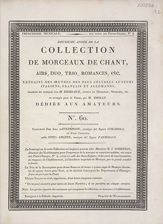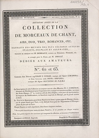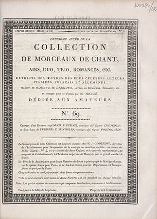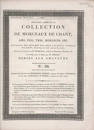 Duetto per soprano e tenore nel Matrimonio segreto / del Signor Cimarosa. - Paris : H. J. Godefroy, [około 1805]. - [1], strony 98-112 ; 34x26 cm.