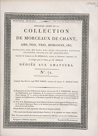 (Collection de morceaux de chant, airs, duo, trio, romances, etc. Extraits des oeuvres des plus célèbres auteurs [...], traduits en français par M. Desriaux et arrangés pour le piano par Thollé ; Nr 71)