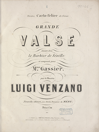 Grande valse : chantée dans le Barbier de Séville / composé par Luigi Venzano ; avec paroles françaises de Méry. - Nouvelle édition avec paroles françaises de Méry. - Paris : Heugel et Cie., [około 1854]. - [4], 9 stron : ilustracja (portret) ; 33 cm.