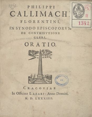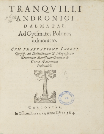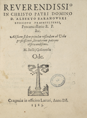 Na stronie tytułowej sygnet drukarza (obelisk).