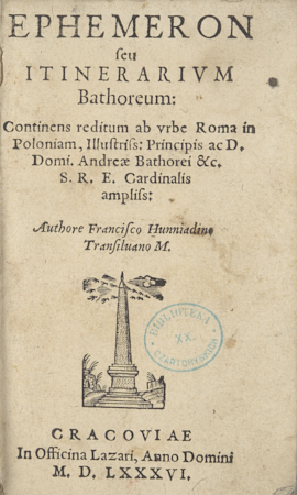 Współwydane: Hunyadi Ferenc, Ob Felicem et Exoptatissimvm: Serenis: Poloniae Regis Stephani ad Oppidvm Mechoviam Adventvm, ac cvm Illvst: Cardinale Nepote Congressvm Carmen Gratulatorium ([12] kart, sygnowanie E⁸, F⁶).
