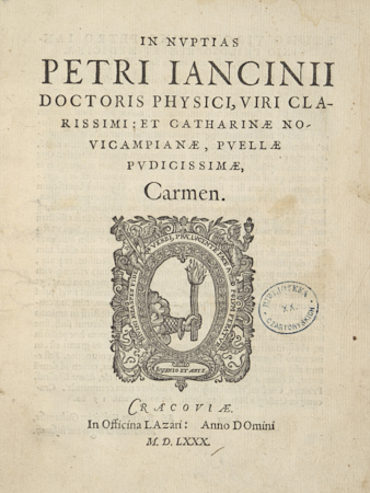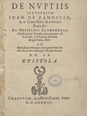 Na karcie tytułowej verso: "In nuptiis Illustrium Ioan. Zamoscii [...] ac Griseldis Bathorrhe [...] Ad lyram cecinit Christoph. Clabonus musicus regius. Idib. Iun. Anno Christi M. D. XXCIII" .
