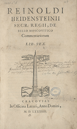 Reinoldi Heidensteinii Secr: Regii |De bello Moscovitico commentariorum : Lib: sex. - Cracoviae : in officina Lazari, 1584. - [1-7] 8-89 [90] 91-151 [152] 153-267 [268] stron, sygnowanie A-Y⁶, Z² ; 2°.